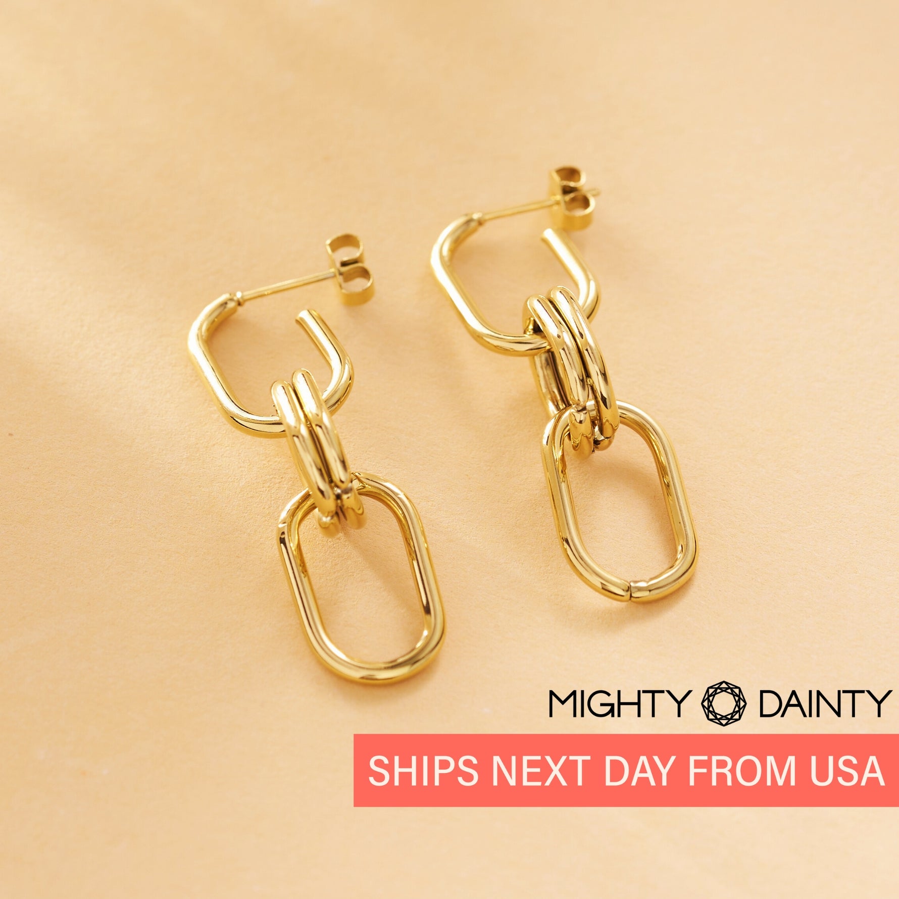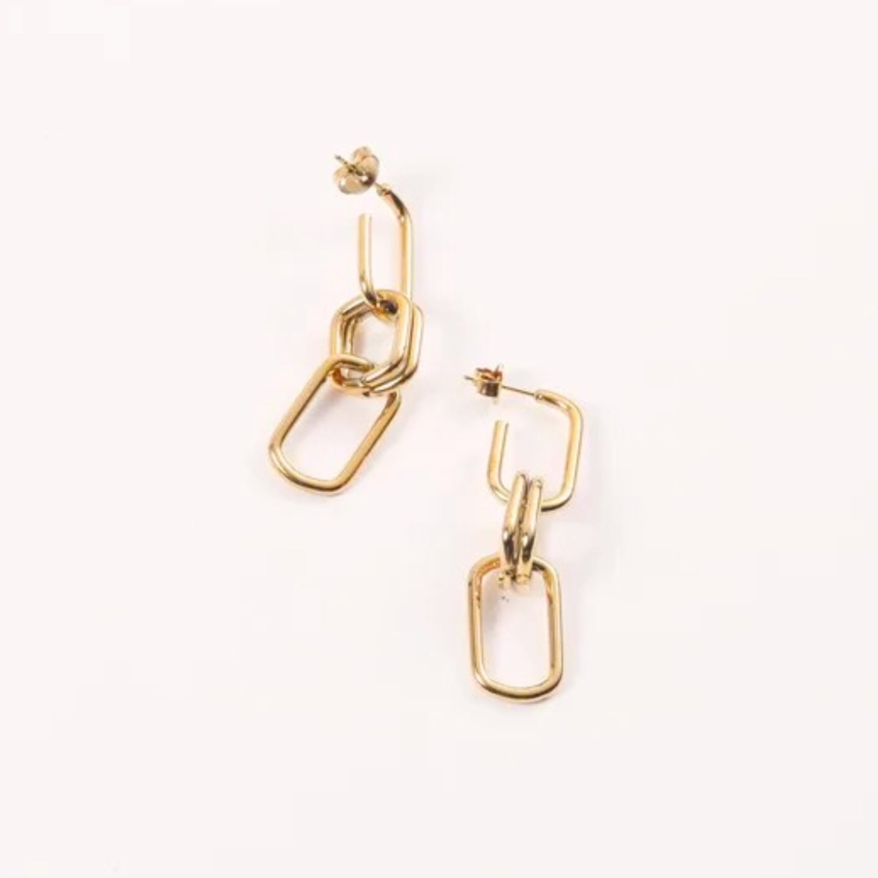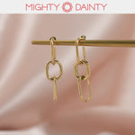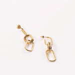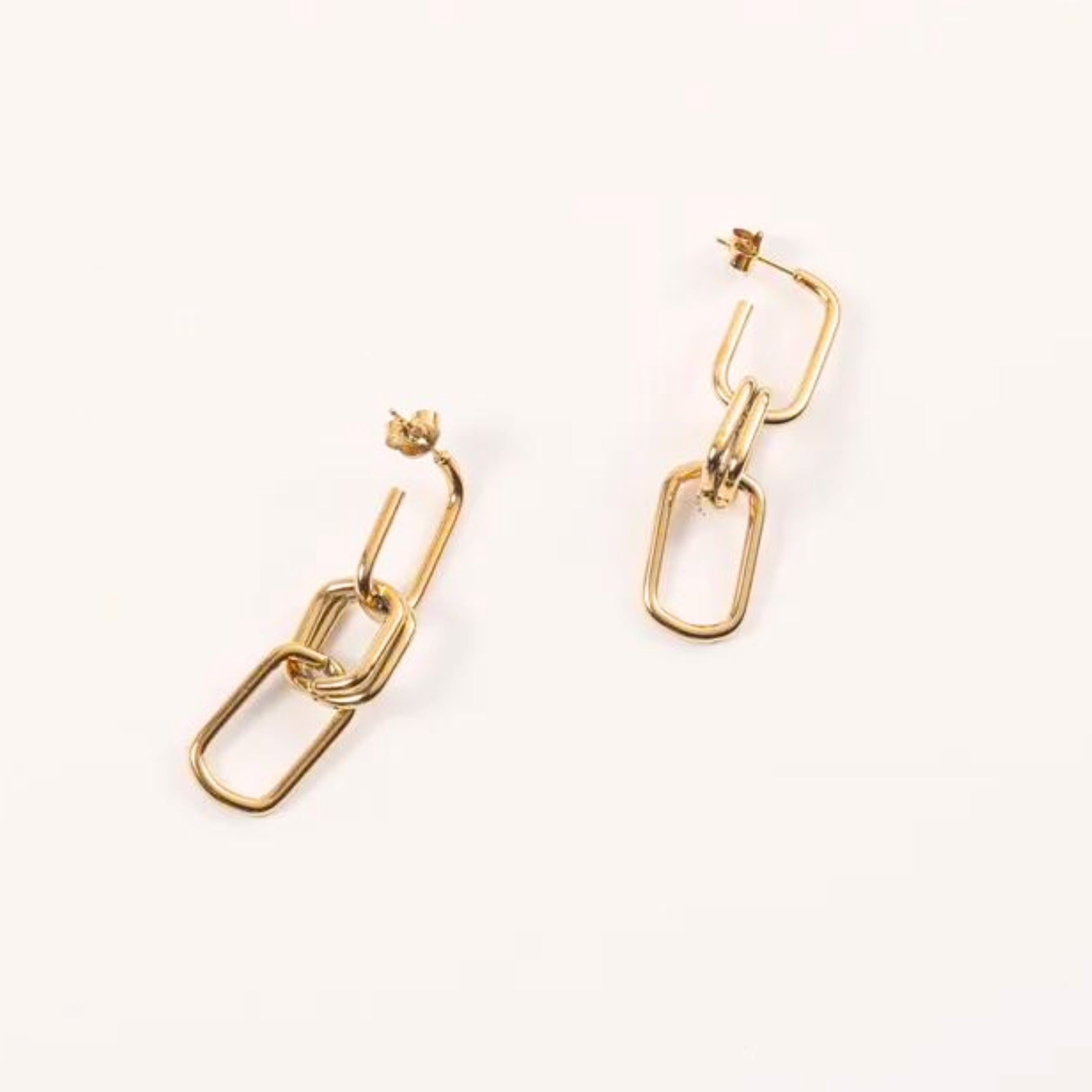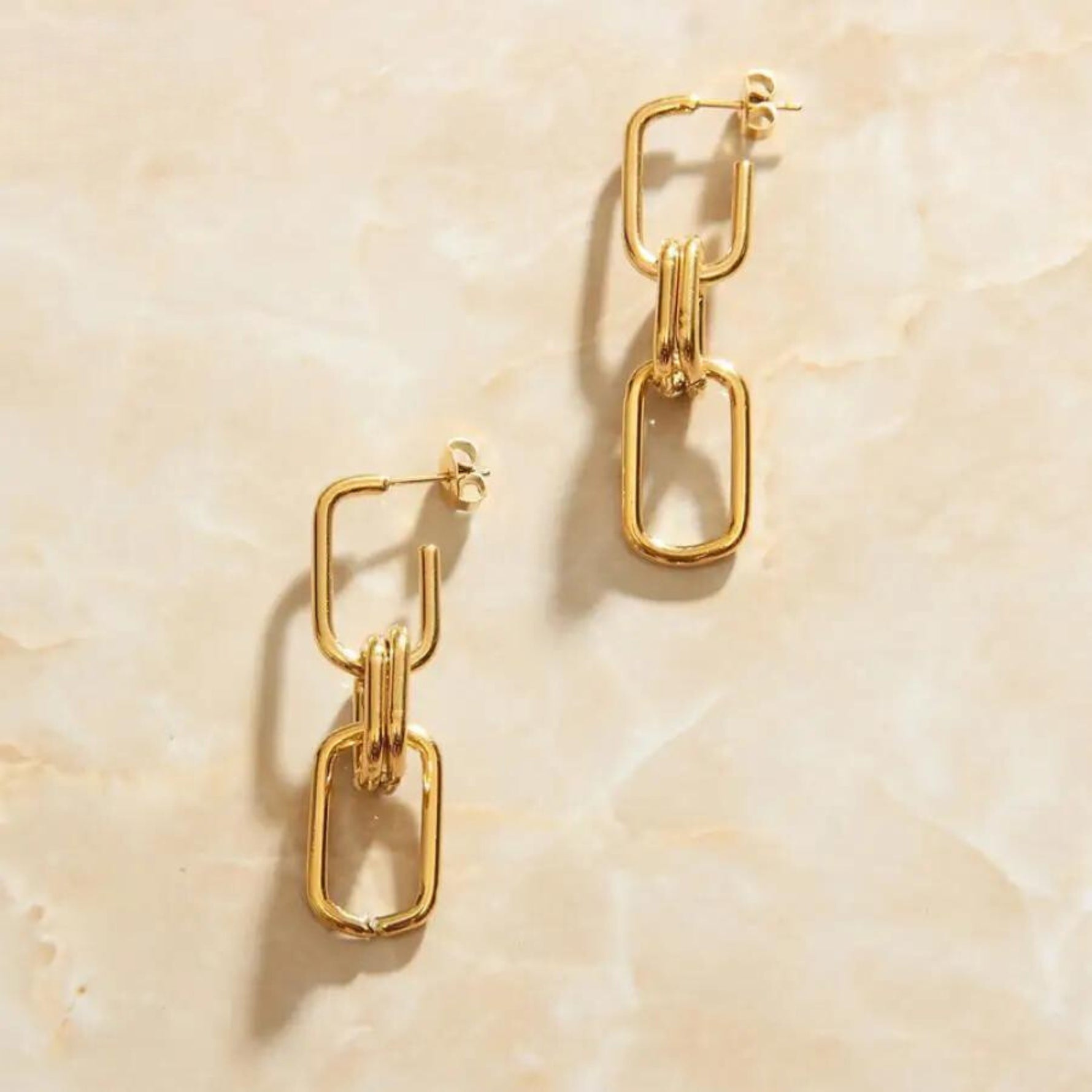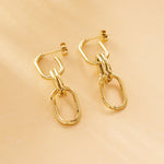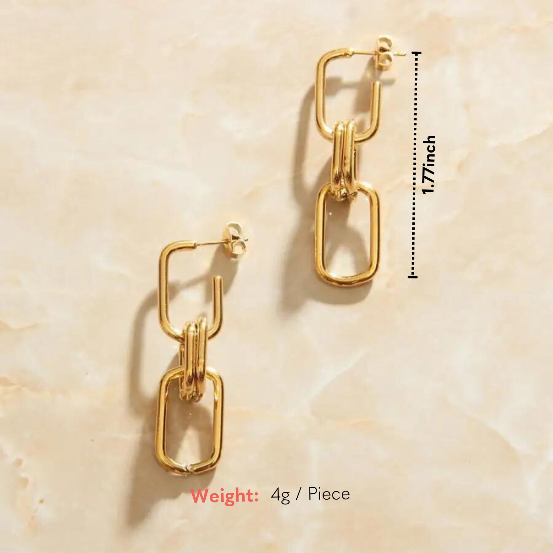 Featuring an interlocking link, each cut and shaped to perfection, our drop earrings create a geometric silhouette that draws the eye. The fluidity of the design adds a dynamic movement, reflecting grace with every step you take. These statement pieces blend intricate craftsmanship with a modern aesthetic, perfect for the contemporary woman who loves to add a touch of sophistication to any outfit.