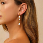 These elegant drop earrings feature a polished gold mini-hoop that flows into a vertical cascade of three baroque-style pearls, each uniquely shaped for an organic, luxurious look. The pearls are connected with delicate gold links, creating a soft, elongated silhouette that moves gracefully with every turn of the head.