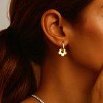 The charming flower accents on the hoops brings a touch of sunshine to your everyday style. A smooth gold hoop holds a minimalist clover-petal charm that sways gently with every turn of your head. The silhouette is clean and modern, yet warm with a hint of playful elegance.