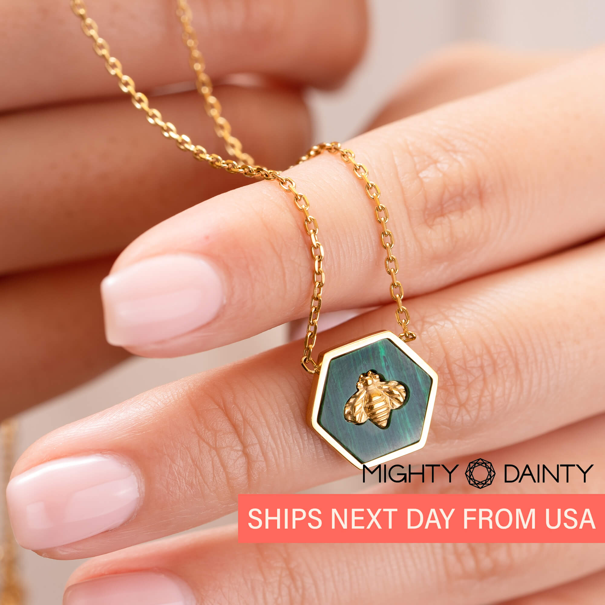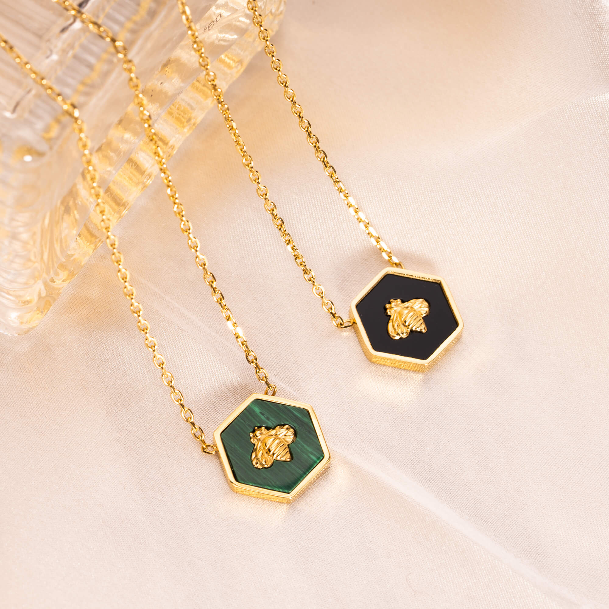This stunning hexagon pendant with a buzzing bee in the middle shows off your playful side. You've got two color and stone options: the earthy malachite green and the bold black shell. Get one or get both to create your statement look.