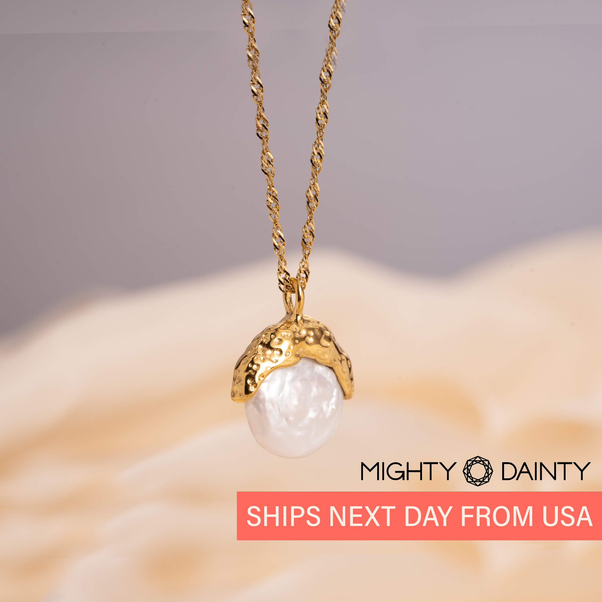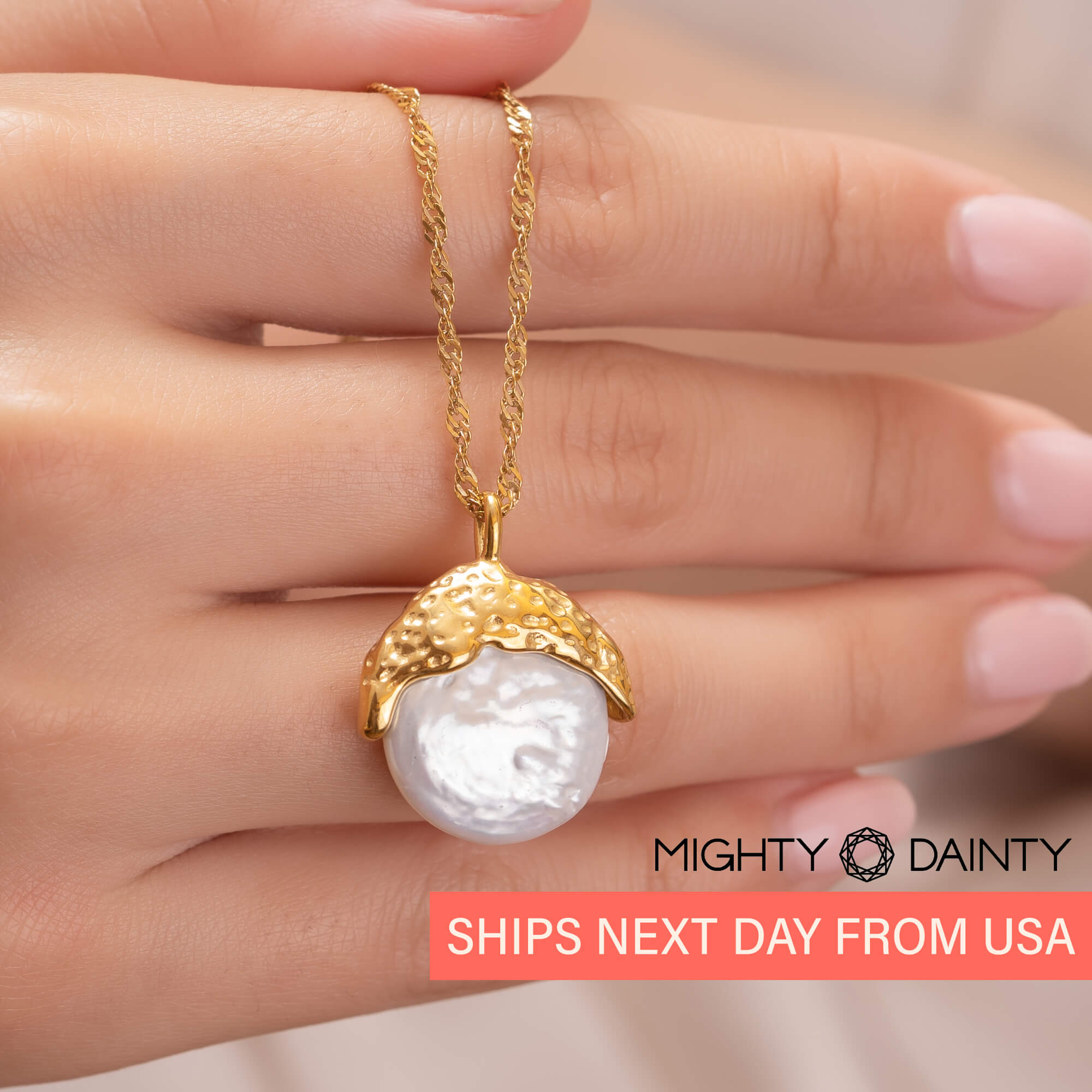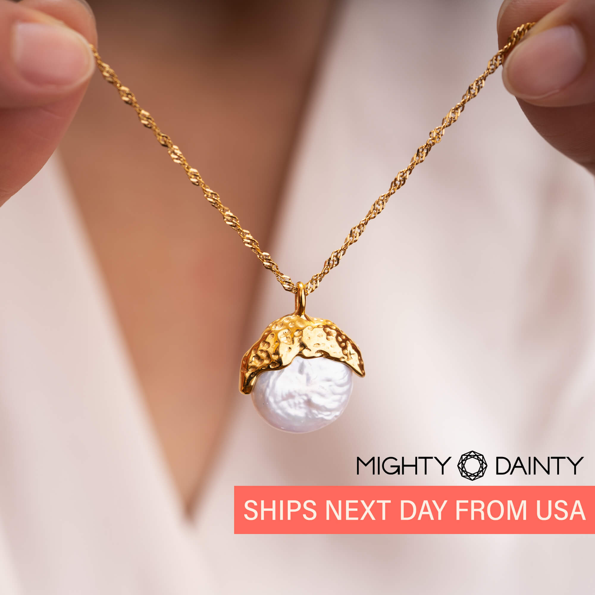 Be reminded of the sea's calmness wherever you go with this dainty necklace featuring a single freshwater pearl covered with a hammered gold shell. The pendant hangs from a twisted chain delicately and is perfect for pairing with different necklaces.