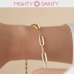 This bracelet's design is like your fashionable sidekick, with its sleek, modern paper clip-inspired links that add a trendy twist to any outfit. But it's not just eye candy – it's a multitasking superstar. Use it as a wrist candy piece on its own, or mix and match with your favorite bracelets to create a personalized arm party.