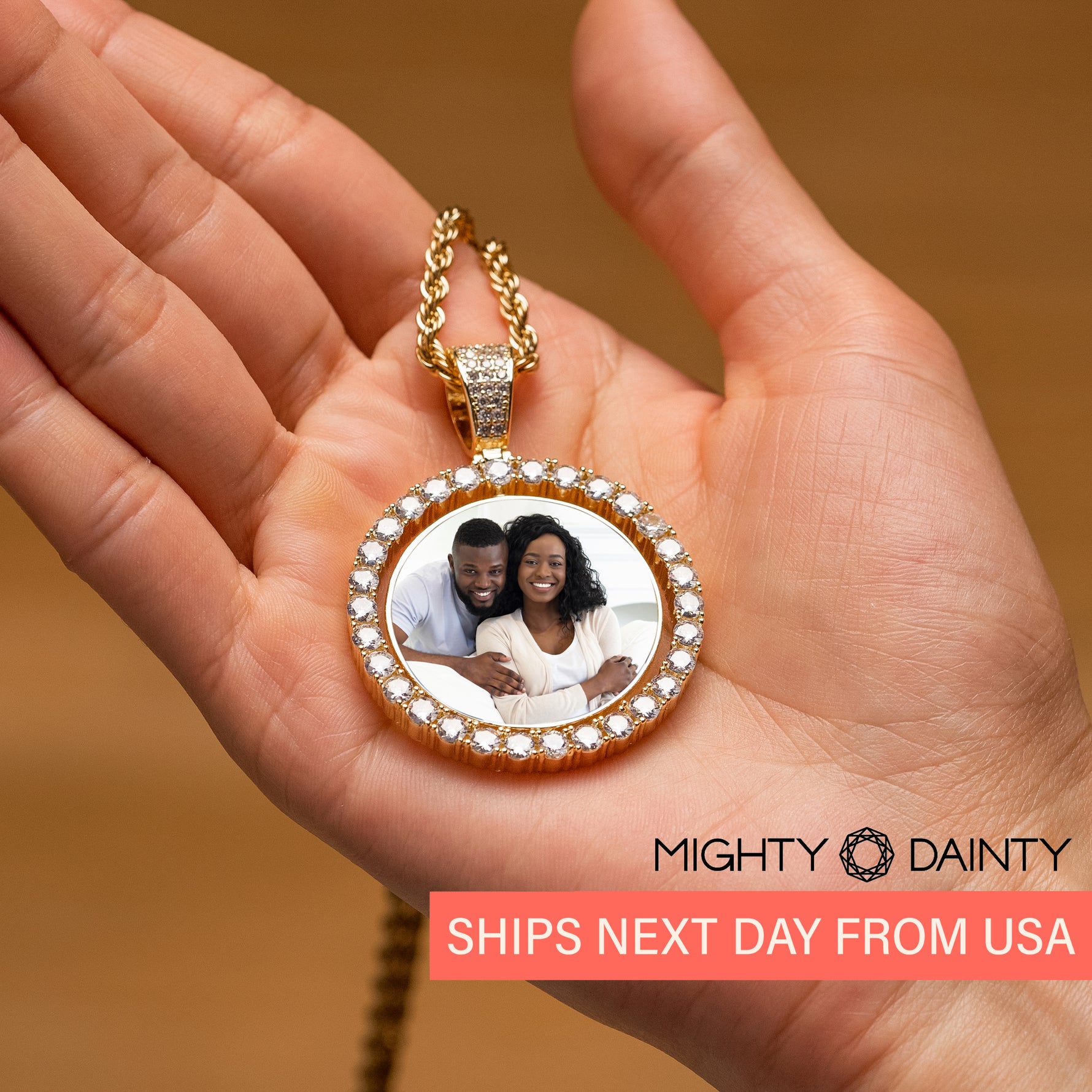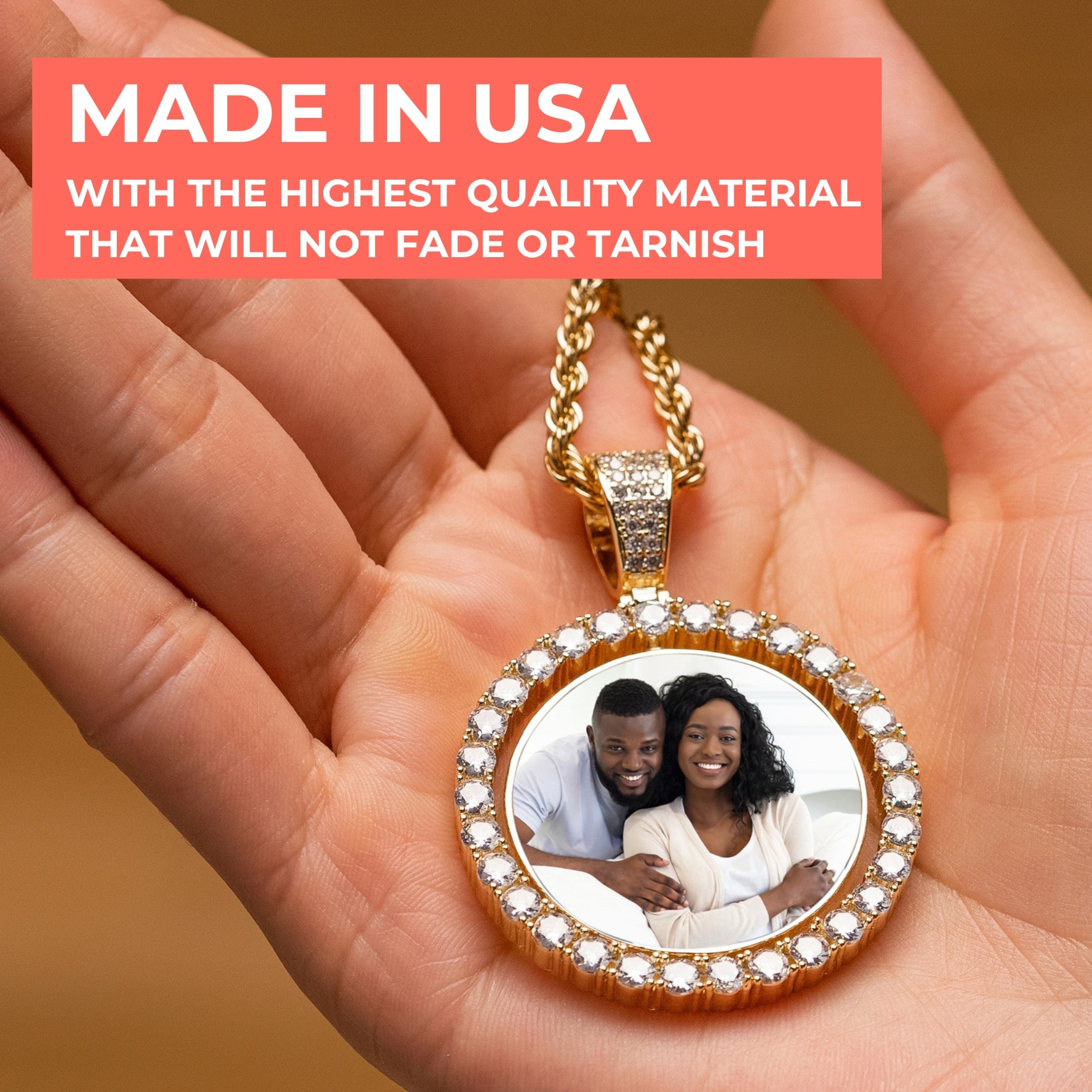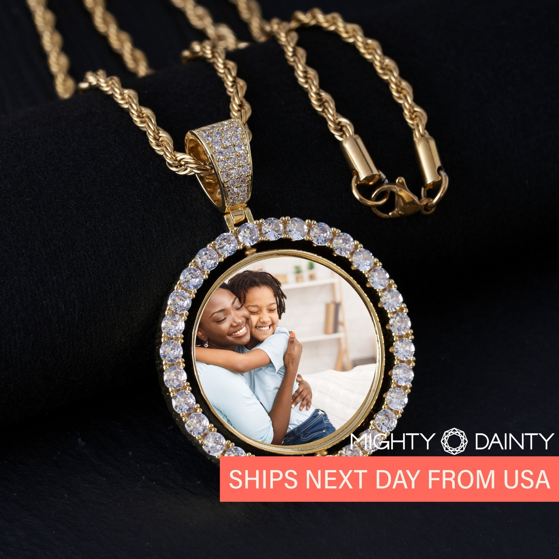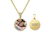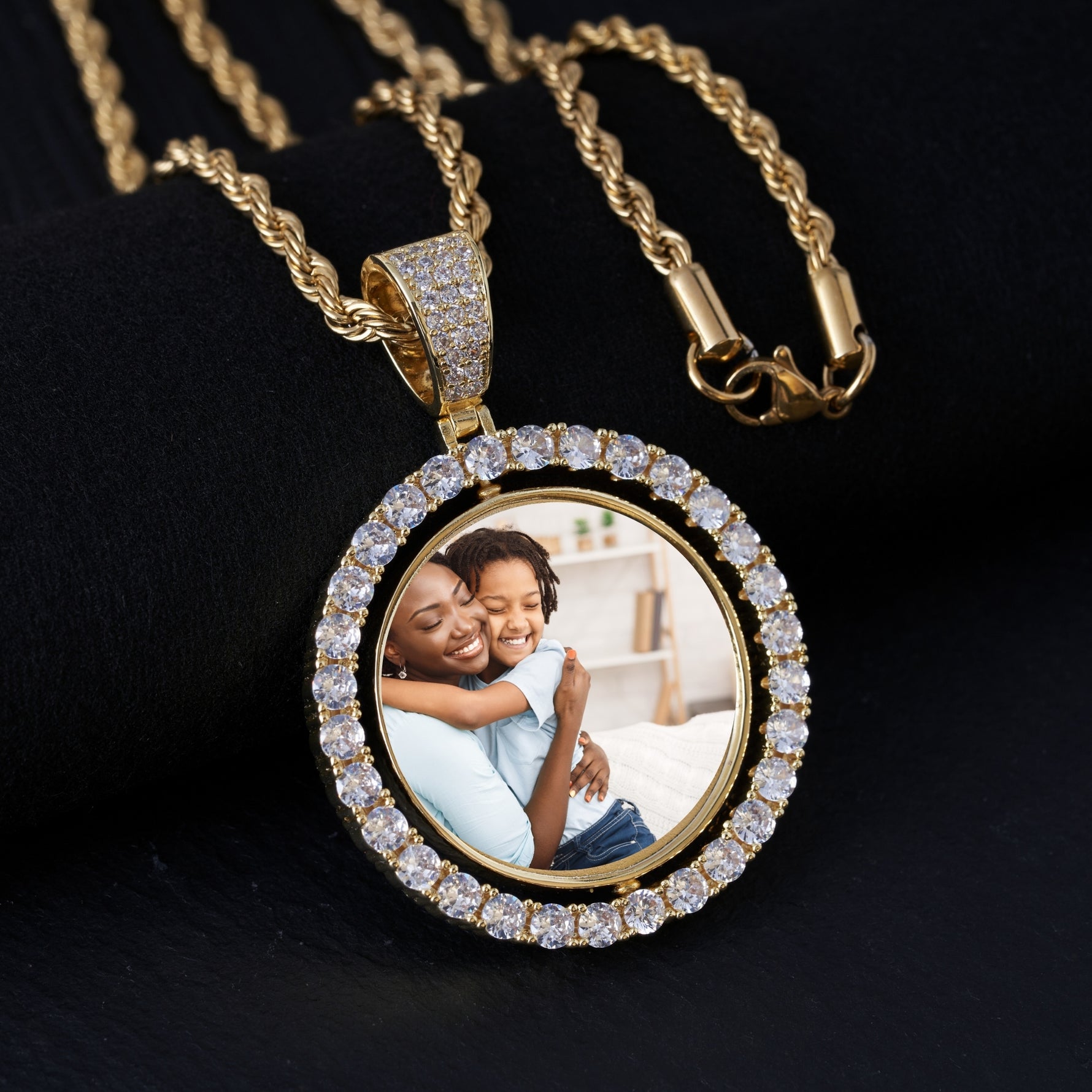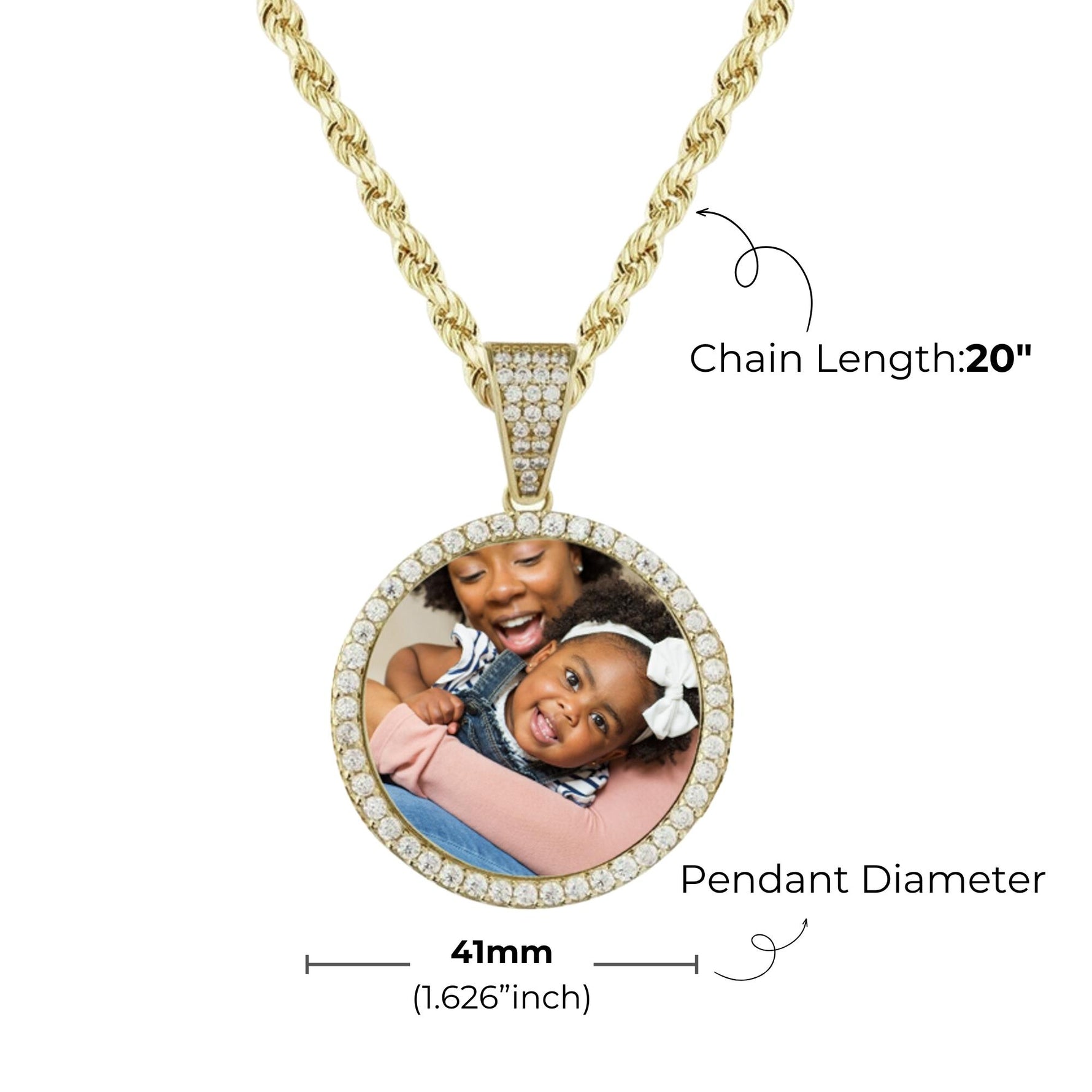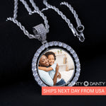This diamond hip hop necklace features a circle pendant with diamond-embedded bezel that can be customized with any picture and paired with a rope chain. This customizable photo diamond necklace compliments any outfit, and is fun for everyday wear or special events.