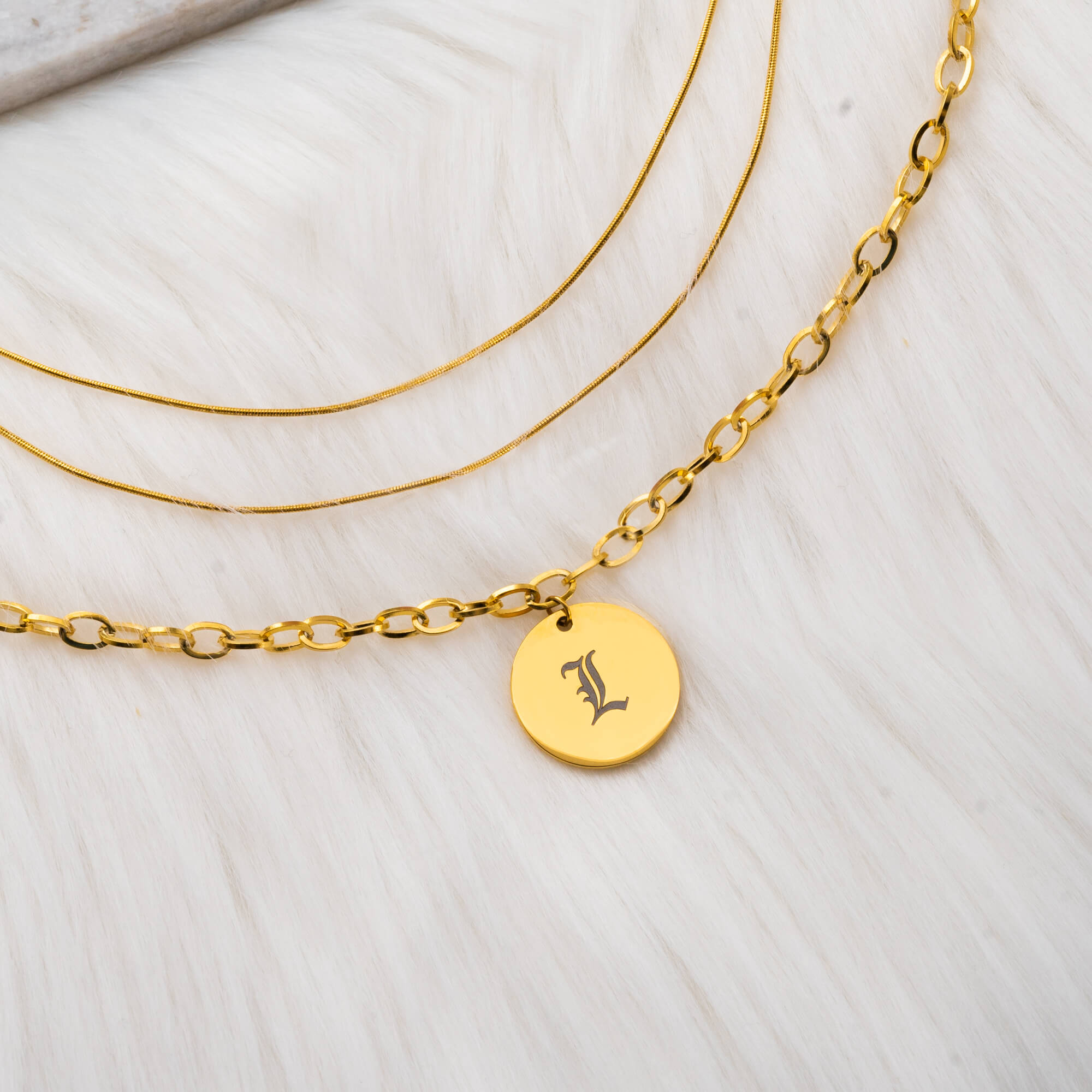 This unique necklace set features a delicate herringbone choker and a captivating link chain initial necklace with a vintage-inspired Old English pendant. Engraved with your chosen initial, it becomes a one-of-a-kind accessory