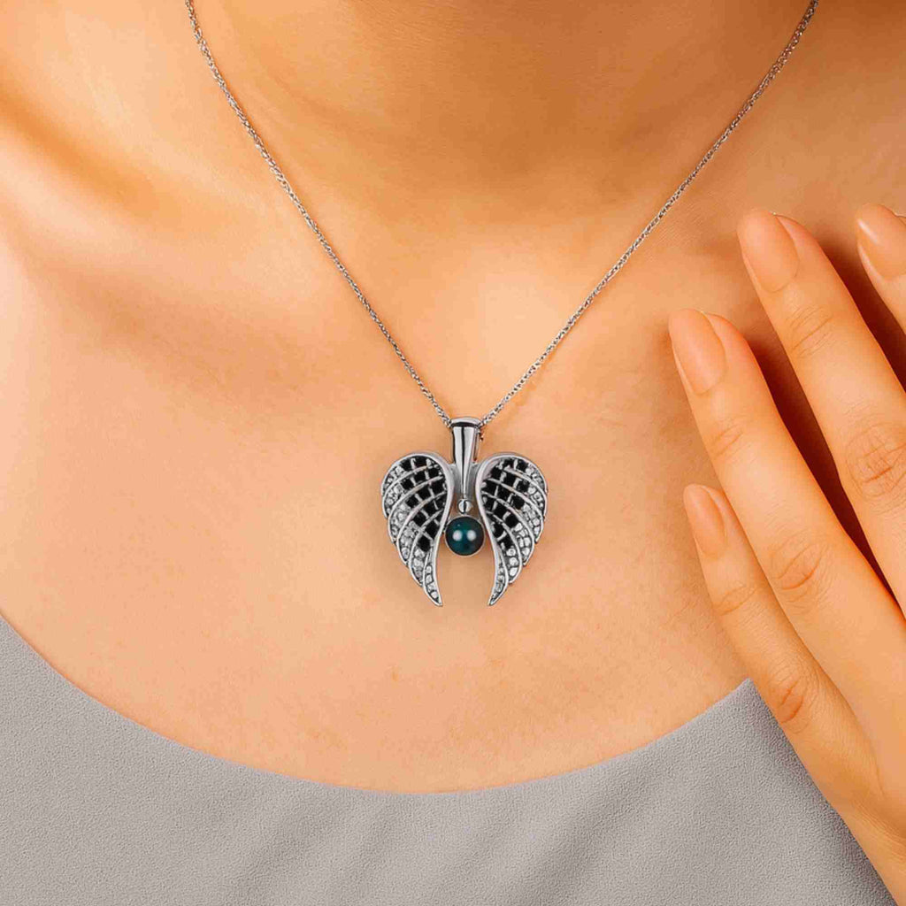 This angel wings necklace with photo turns a classic keepsake into something truly striking. Crystal-studded wings curve gracefully around a smooth black stone, which hides your chosen image in crisp black and white. Just look closely or shine a light through, and your memory appears in perfect detail.