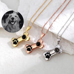 This personalized pet photo necklace is for dog lovers who want to carry a little piece of their pup everywhere. Shaped like a bone with a tiny paw cutout, the pendant holds a smooth center stone that hides your chosen black-and-white photo – just look closely or shine a light to see it appear.