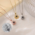 The Sun Custom Photo Projection Necklace captures the warmth of a special moment in a radiant design. Shaped like a shining sun with crystal-tipped rays, the pendant’s center stone conceals your chosen black-and-white image. A quick glance inside or a beam of light reveals the detail, making it a wearable memory with extra sparkle.