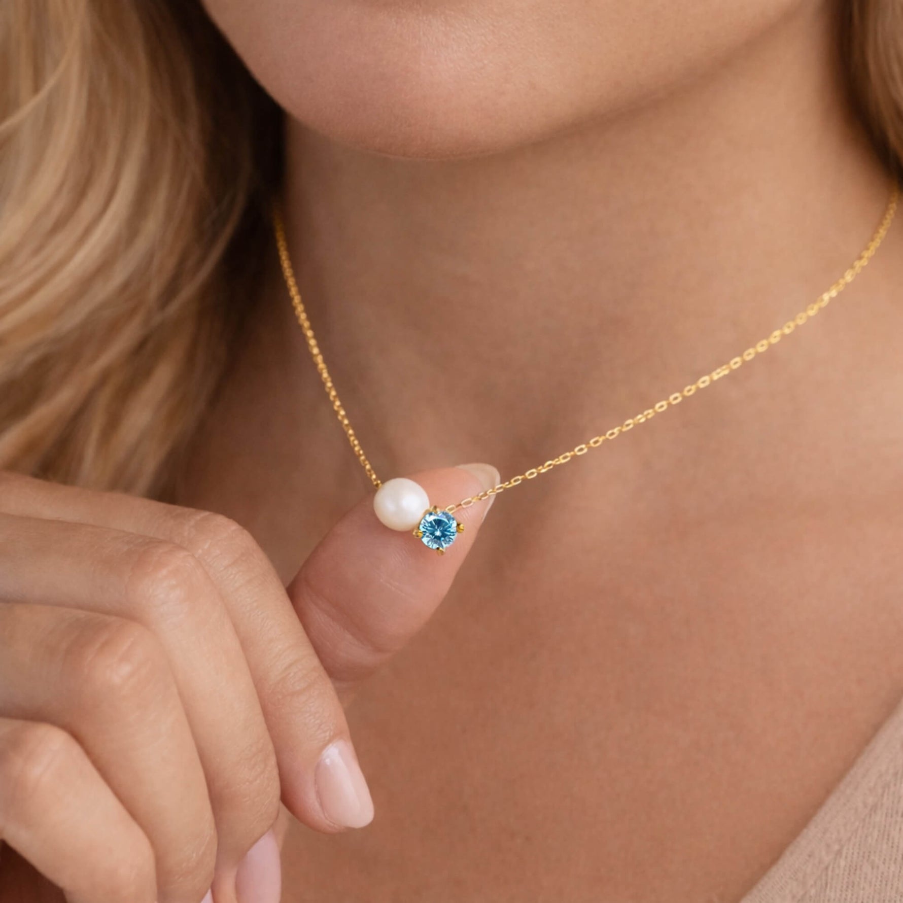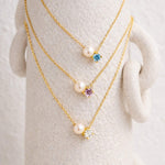 The Pearl & Gem Duo Necklace pairs classic softness with a touch of color in a clean, modern design. Each necklace features a luminous pearl alongside a single faceted gemstone, set side by side on a delicate gold chain for effortless everyday wear.