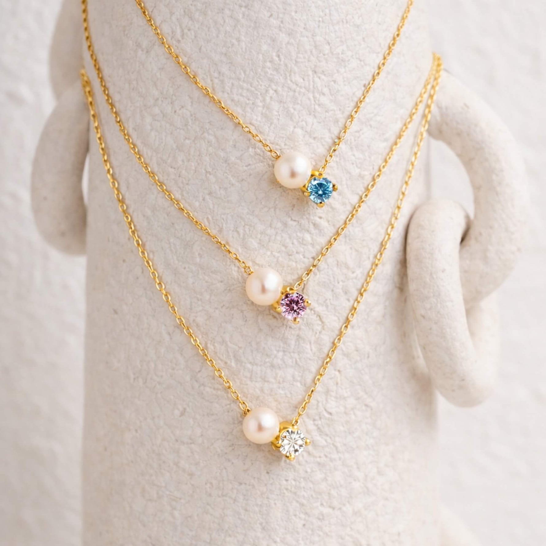 Designed with simplicity in mind, this necklace is offered in three carefully selected gem colors, each chosen to complement the natural glow of the pearl while remaining timeless and versatile. The balanced pairing creates a subtle contrast—elegant without feeling formal, personal without being overstyled.