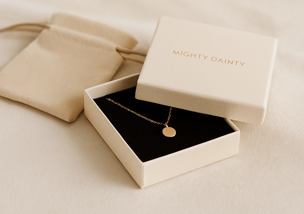 How you store your jewelry matters as much as how you wear it. Each piece should rest separately so the chains never tangle and the metal never scratches. The original Mighty Dainty box or a soft pouch makes a safe home, protecting it from dust and humidity. A cool, dry place keeps the metal bright and the memories safe.