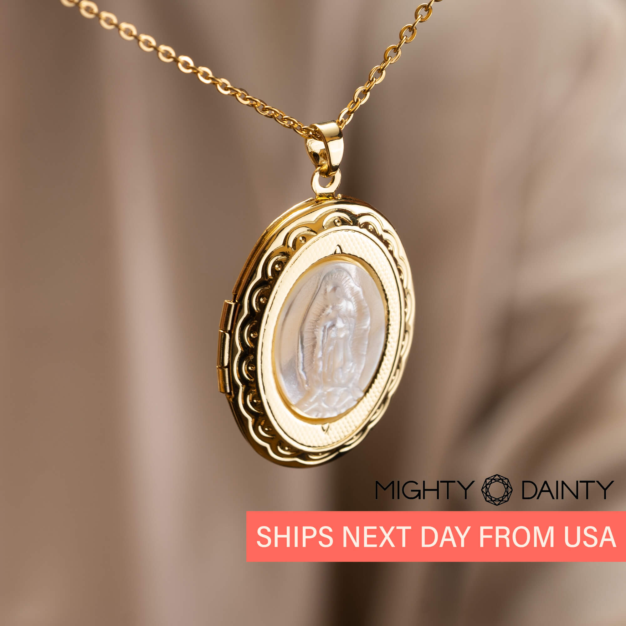 The Virgin Mary Photo Necklace brings traditional detail to a deeply personal piece. The outer locket features a raised Virgin Mary figure surrounded by ornate engraving, with a pearlescent inlay that adds soft contrast. Inside, there’s room for two photos – whether it’s childhood pictures, old family portraits, or people you just want to keep close. This necklace with picture inside combines sacred symbolism with a format that’s meant to be worn daily.